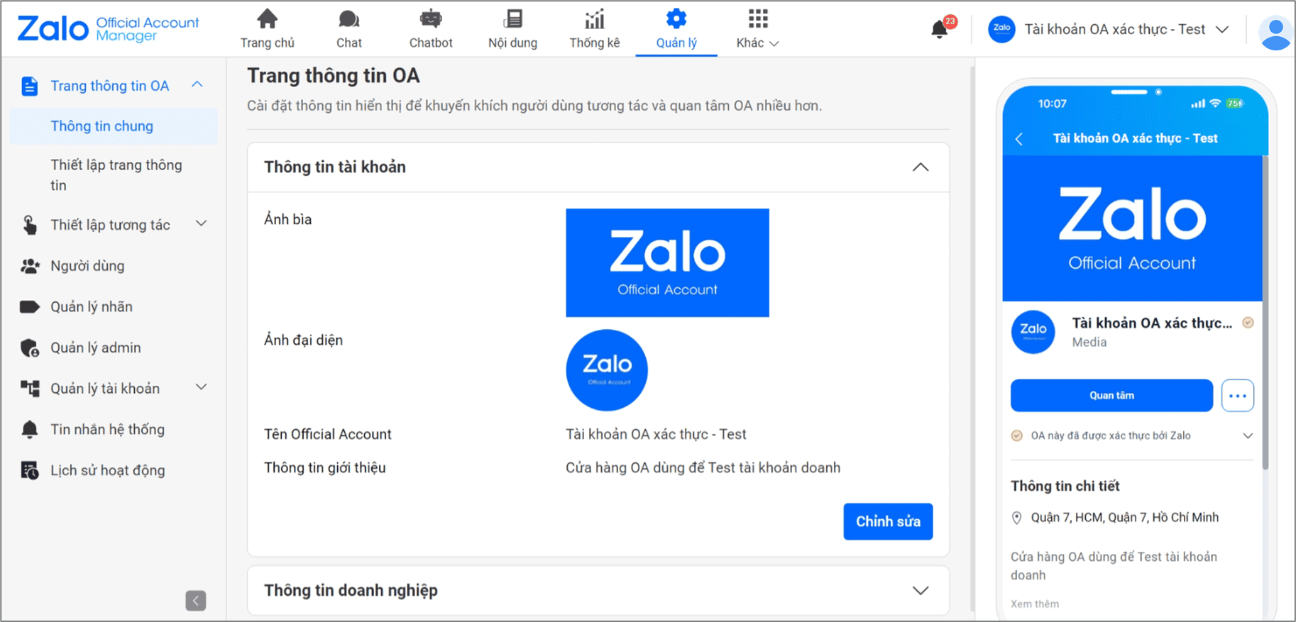 OA Xác thực là tài khoản OA đã được xác thực bởi Zalo và hiển thị dấu tích vàng chứng nhận ở tên OA.